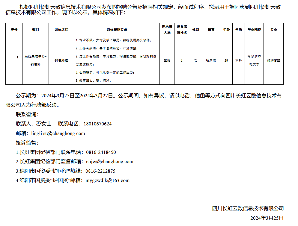 四川長虹云數(shù)信息技術(shù)有限公司關(guān)于招聘銷售助理擬錄用人員的公示