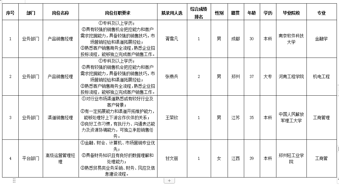 根據(jù)四川長(zhǎng)虹佳華信息產(chǎn)品有限責(zé)任公司發(fā)布的招聘公告及招聘相關(guān)規(guī)定,經(jīng)面試、考察、體檢等程序,擬錄用胥雪凡、張燕兵、王榮欽、甘文麗同志到四川長(zhǎng)虹佳華信息產(chǎn)品有限責(zé)任公司工作,現(xiàn)予以公示,具體情況如下: