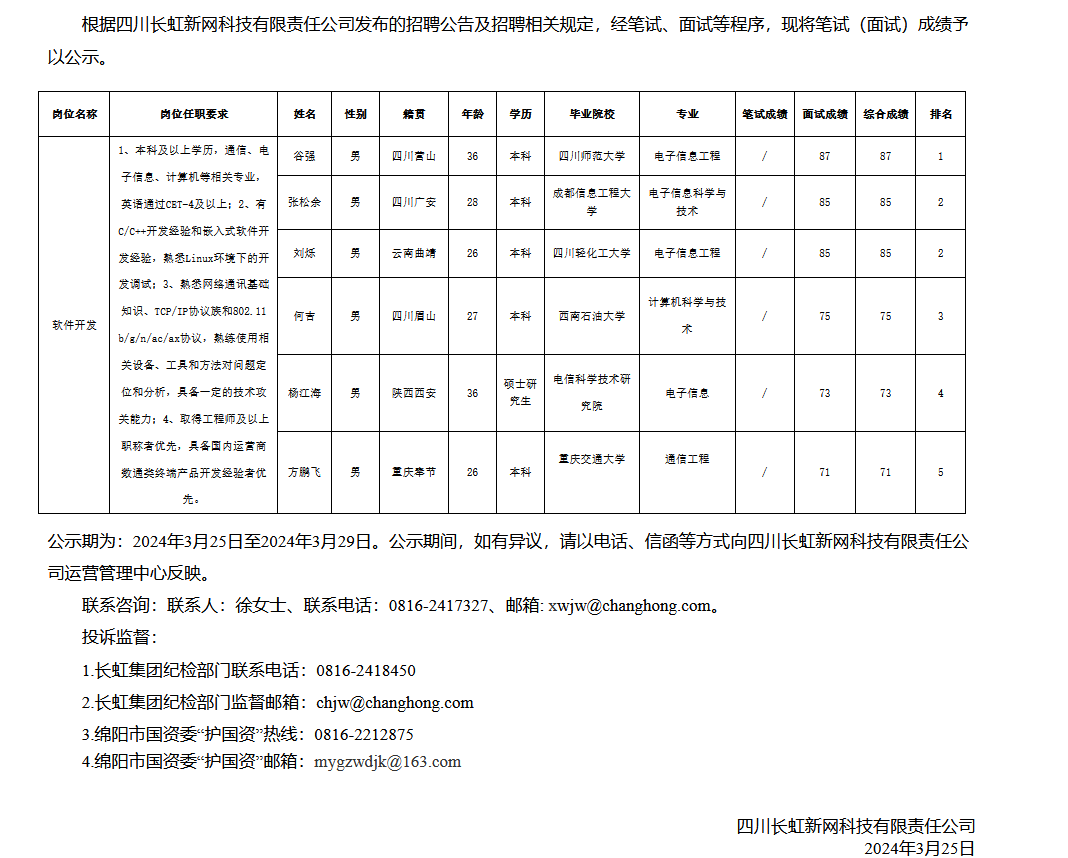四川長(zhǎng)虹新網(wǎng)科技有限責(zé)任公司關(guān)于招聘軟件開(kāi)發(fā)崗成績(jī)的公示