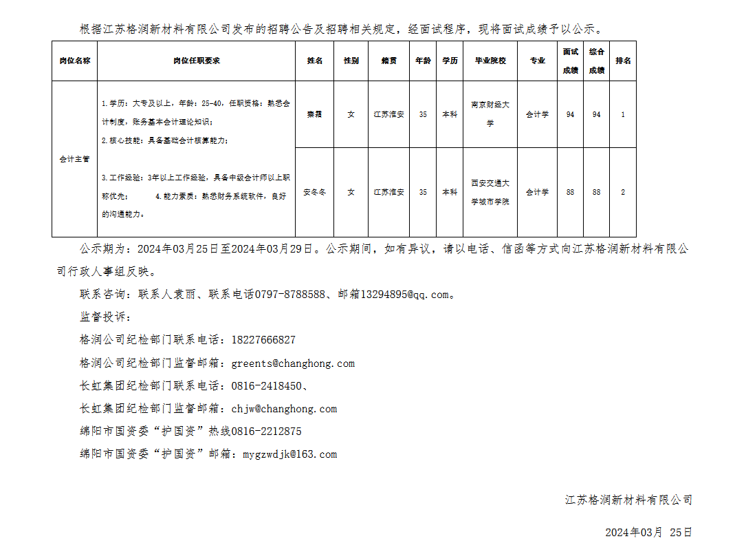 江蘇格潤新材料有限公司關(guān)于招聘會計主管成績的公示