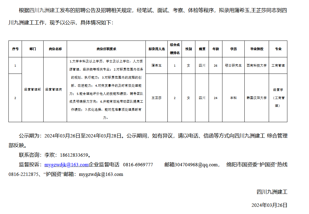 四川九洲建工關于招聘經(jīng)營管理崗擬錄用人員的公示