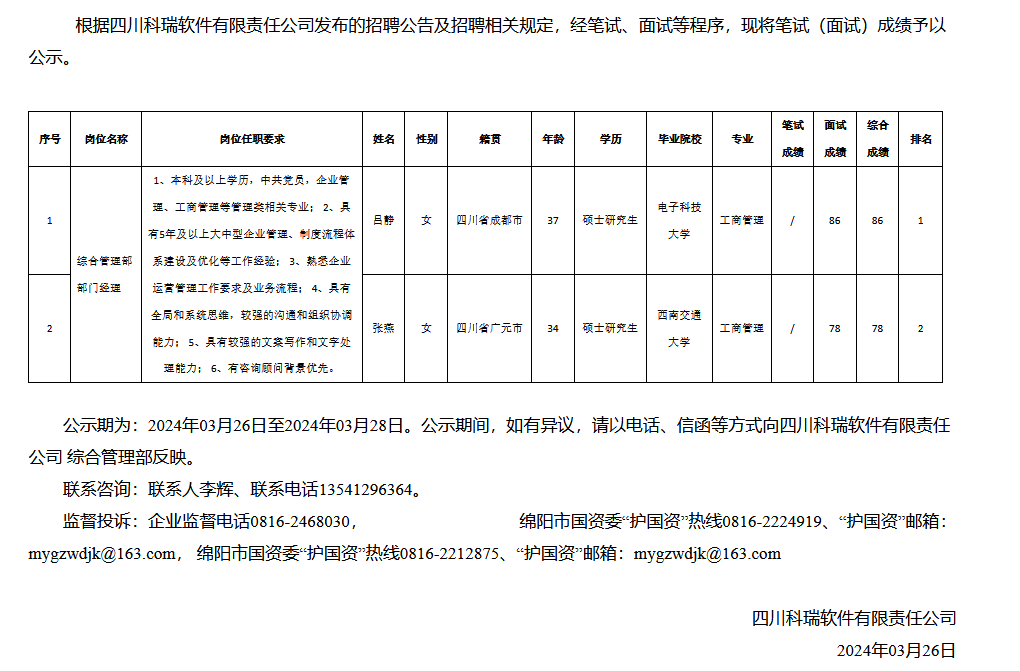 四川科瑞軟件有限責任公司關于招聘綜合管理部部門經理成績的公示