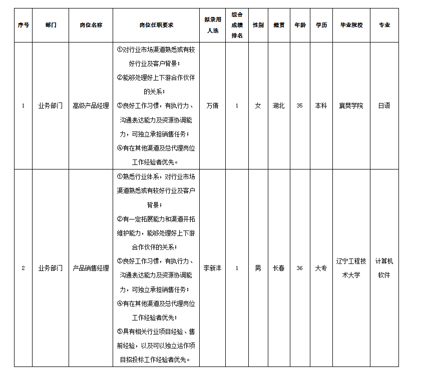 根據(jù)四川長(zhǎng)虹佳華信息產(chǎn)品有限責(zé)任公司發(fā)布的招聘公告及招聘相關(guān)規(guī)定,經(jīng)面試、考察、體檢等程序,擬錄用萬(wàn)倩、李新洋同志到四川長(zhǎng)虹佳華信息產(chǎn)品有限責(zé)任公司工作,現(xiàn)予以公示,具體情況如下: