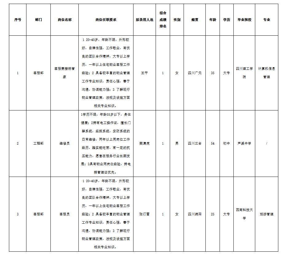 根據(jù)四川長(zhǎng)虹物業(yè)服務(wù)有限責(zé)任公司綿陽(yáng)分公司發(fā)布的招聘公告及招聘相關(guān)規(guī)定,經(jīng)筆試、面試、考察、體檢等程序,擬錄用王平、樊清虎、張汀雪到廣元天匯城管理處、國(guó)際城管理處、金嶺1號(hào)管理處工作,現(xiàn)予以公示,具體情況如下: