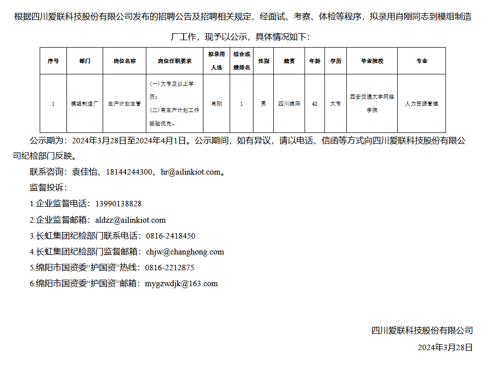 四川愛(ài)聯(lián)科技股份有限公司關(guān)于招聘生產(chǎn)計(jì)劃主管崗位擬錄用人員的公示