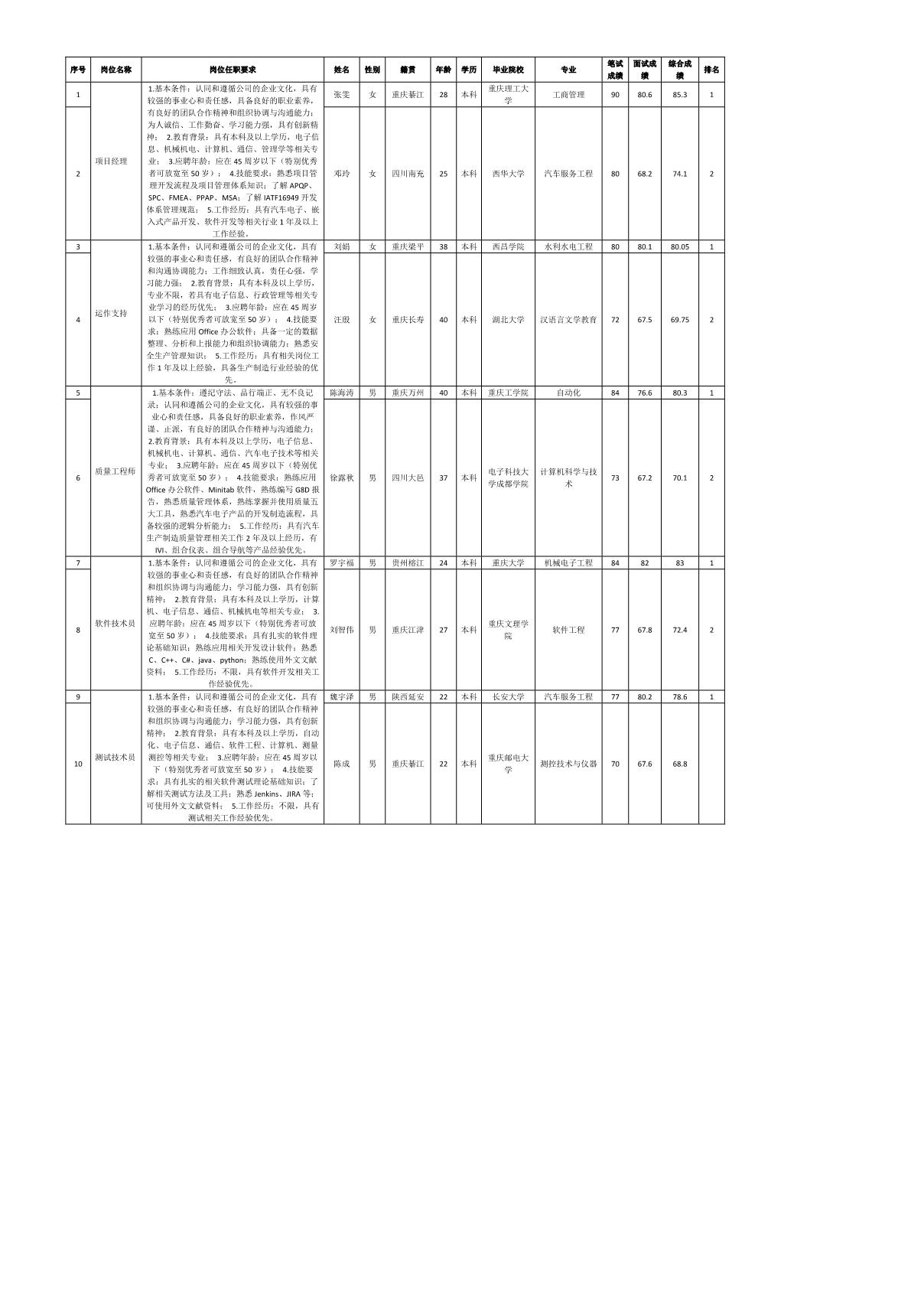 根據(jù)重慶九洲隆瓴科技有限公司發(fā)布的招聘公告及招聘相關(guān)規(guī)定,經(jīng)筆試、面試等程序,現(xiàn)將筆試(面試)成績予以公示。