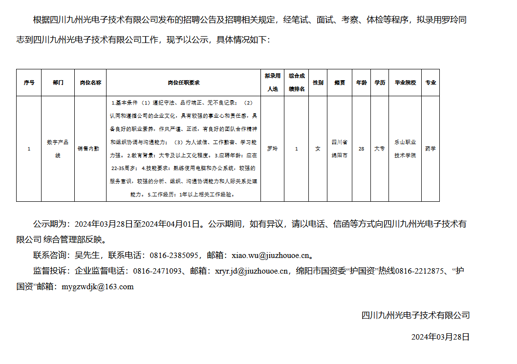 四川九州光電子技術(shù)有限公司關(guān)于招聘銷售內(nèi)勤崗位擬錄用人員的公示