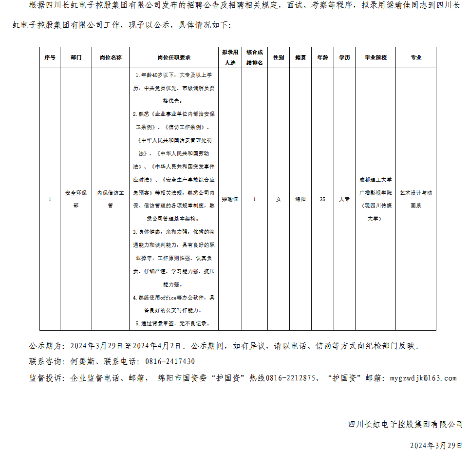 四川長虹電子控股集團(tuán)有限公司關(guān)于招聘內(nèi)保信訪主管擬錄用人員的公示