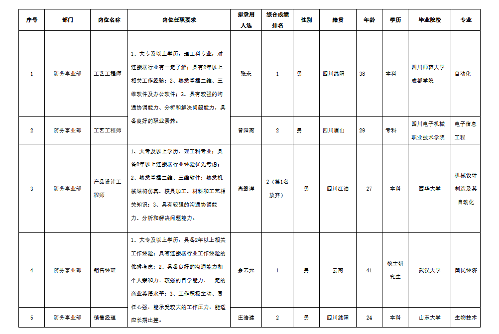 根據(jù)四川華豐科技股份有限公司發(fā)布的招聘公告及招聘相關(guān)規(guī)定,經(jīng)筆試、面試、考察、體檢等程序,擬錄用張未等同志到四川華豐科技股份有限公司工作,現(xiàn)予以公示,具體情況如下: