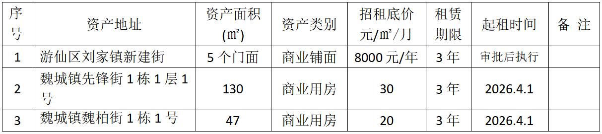 綿陽(yáng)農(nóng)村商業(yè)銀行股份有限公司將對(duì)3處優(yōu)質(zhì)資產(chǎn)進(jìn)行公開(kāi)招租: