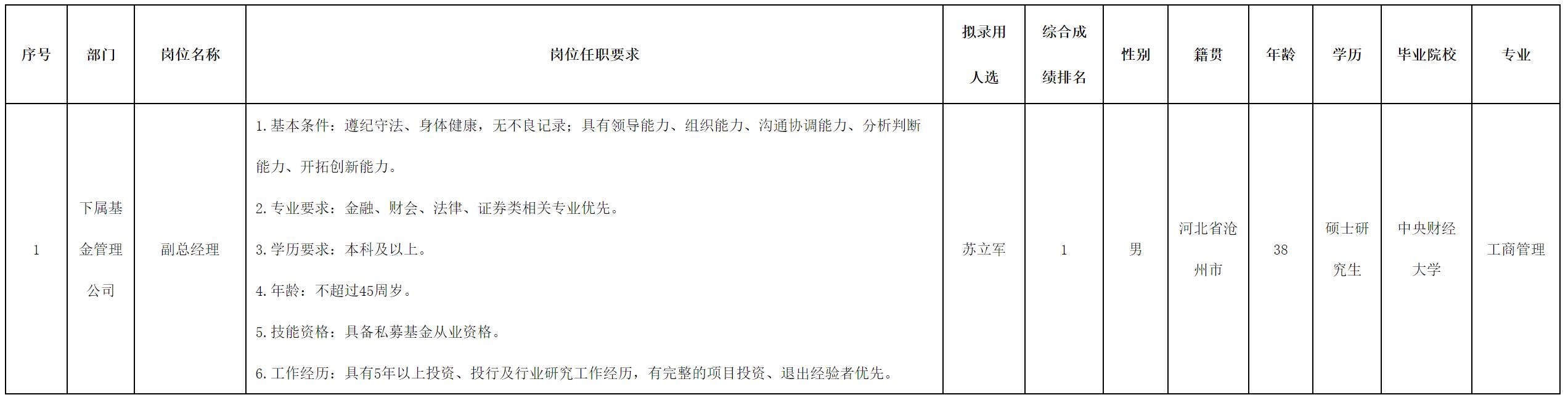 根據(jù)四川長虹創(chuàng)新投資有限公司發(fā)布的招聘公告及招聘相關(guān)規(guī)定,經(jīng)面試、考察等程序,擬錄用蘇立軍同志到公司工作,現(xiàn)予以公示,具體情況如下: