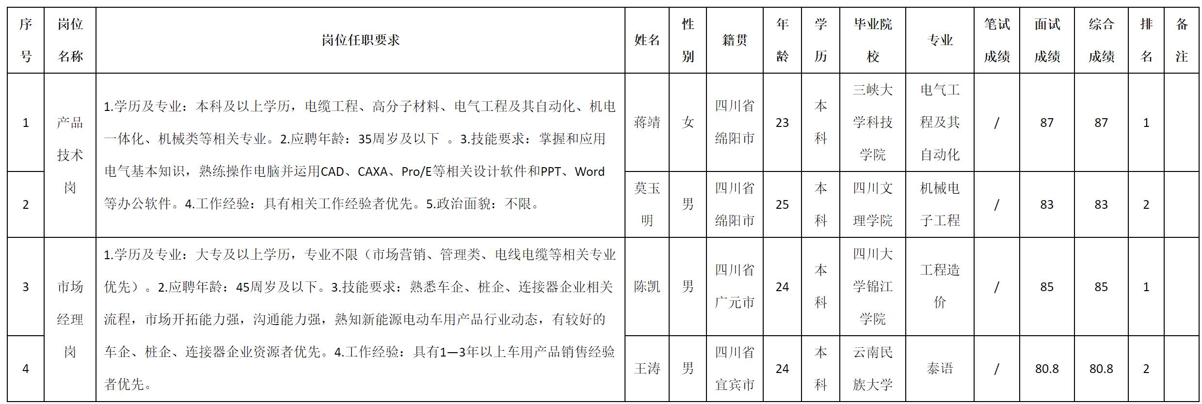 根據(jù)四川九洲線纜有限責任公司發(fā)布的招聘公告及招聘相關規(guī)定,現(xiàn)將測試成績予以公示。