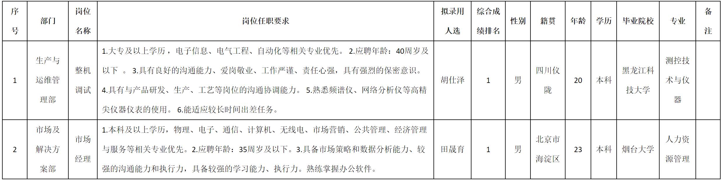 根據(jù)四川九洲防控科技有限責任公司發(fā)布的招聘公告及招聘相關規(guī)定,經測試、考察、體檢等程序,擬錄用胡仕澤等2名同志到四川九洲防控科技有限責任公司工作,現(xiàn)予以公示,具體情況如下: