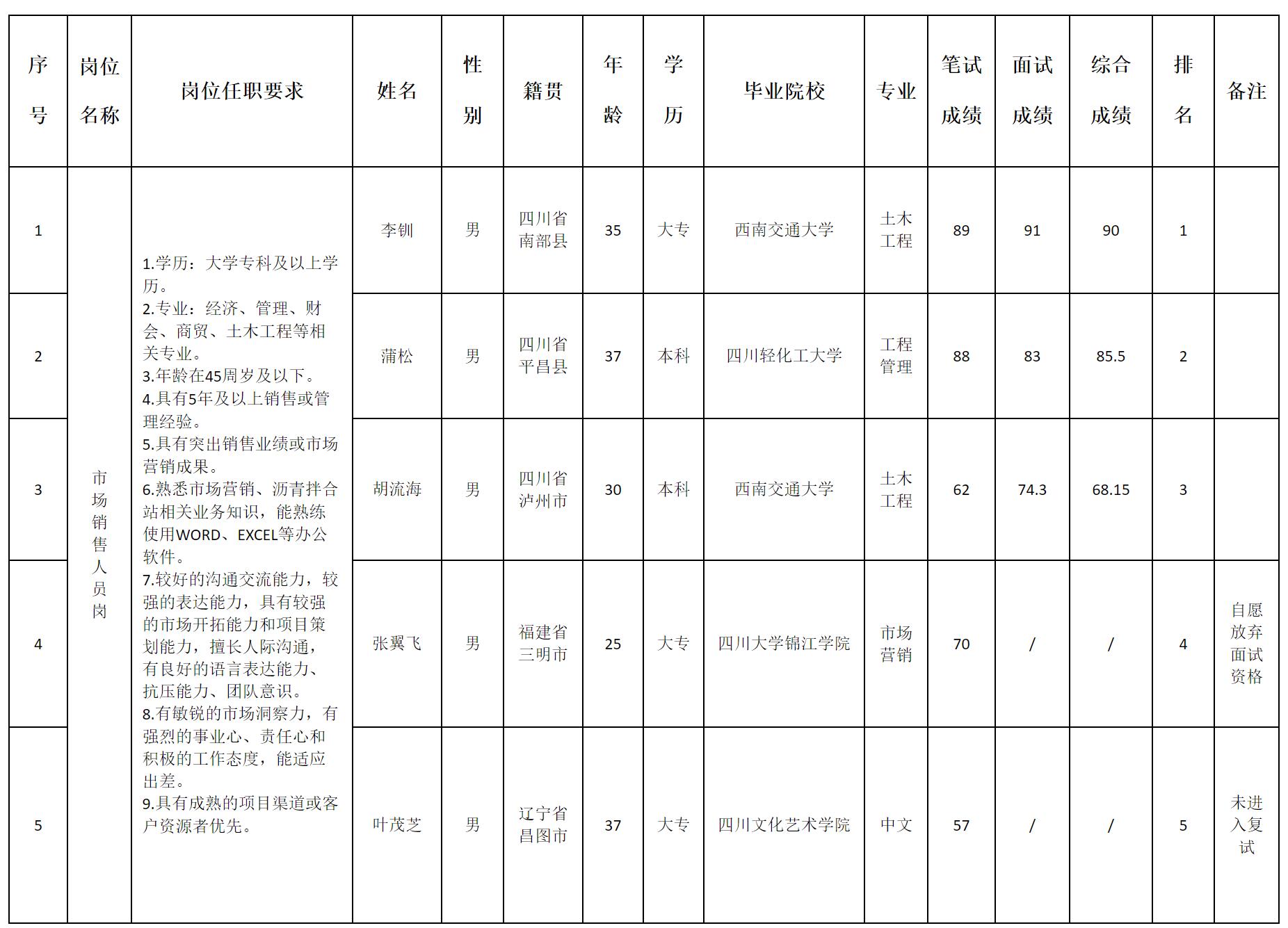根據(jù)綿陽交發(fā)大道新材料科技有限責(zé)任公司發(fā)布的招聘公告及招聘相關(guān)規(guī)定,經(jīng)筆試、面試等程序,現(xiàn)將成績予以公示。