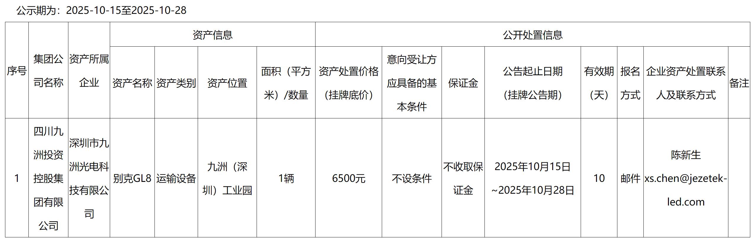 深圳市九洲光電科技有限公司車輛處置公告