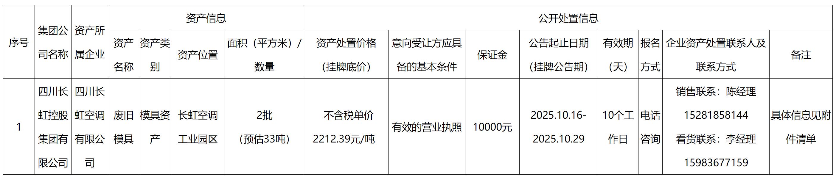 四川長(zhǎng)虹空調(diào)有限公司資產(chǎn)處置公告