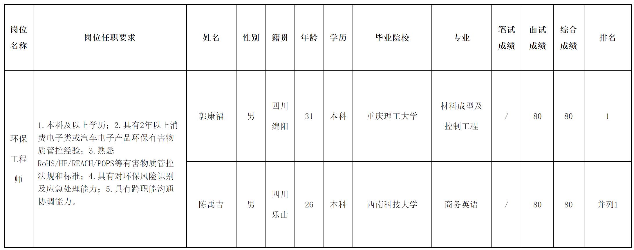 根據(jù)四川華豐科技股份有限公司發(fā)布的招聘公告及招聘相關(guān)規(guī)定,經(jīng)筆試、面試等程序,現(xiàn)將測(cè)試成績(jī)予以公示。