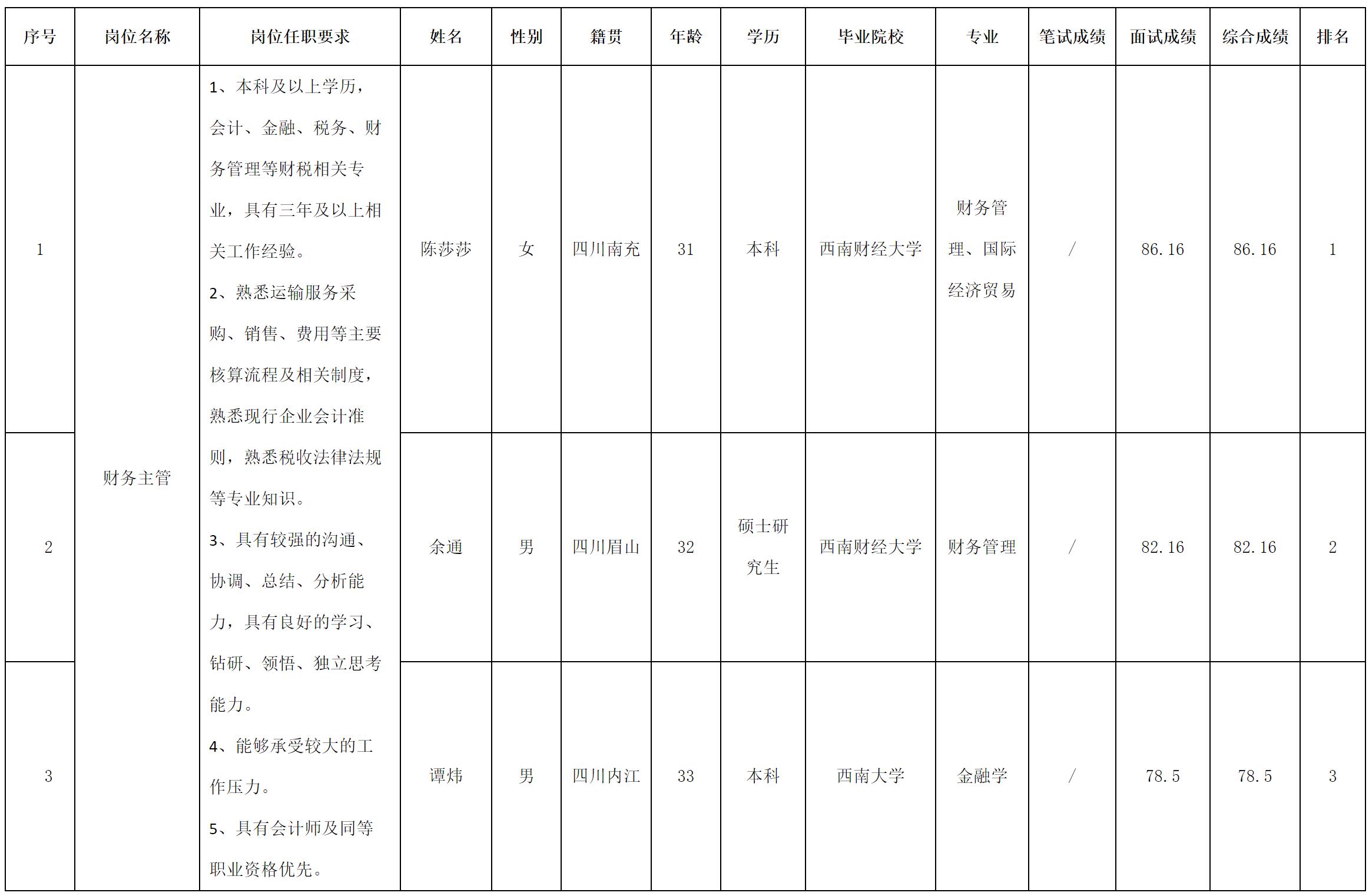 根據(jù)四川長虹民生物流股份有限公司發(fā)布的招聘公告及招聘相關(guān)規(guī)定,經(jīng)面試等程序,現(xiàn)將成績予以公示。
