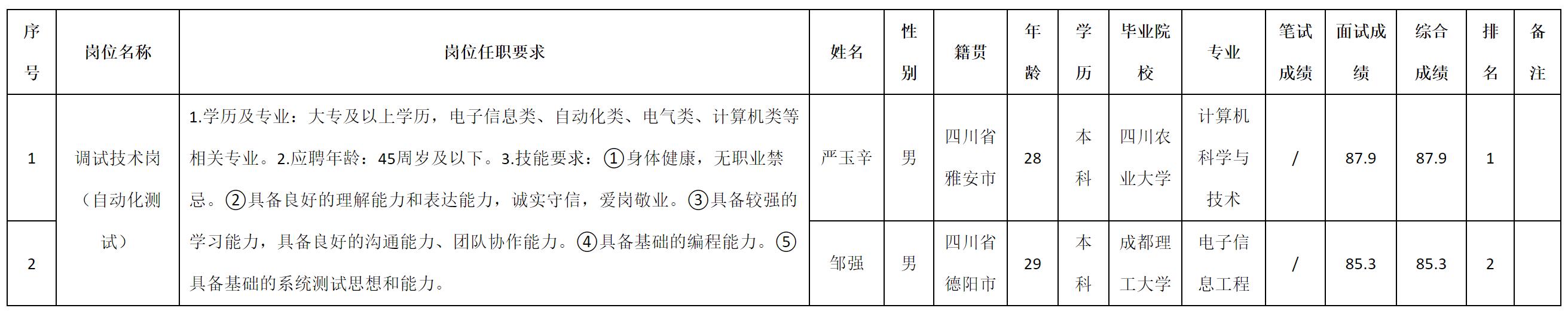 根據(jù)四川九洲電器集團(tuán)有限責(zé)任公司發(fā)布的招聘公告及招聘相關(guān)規(guī)定,現(xiàn)將測(cè)試成績(jī)予以公示。