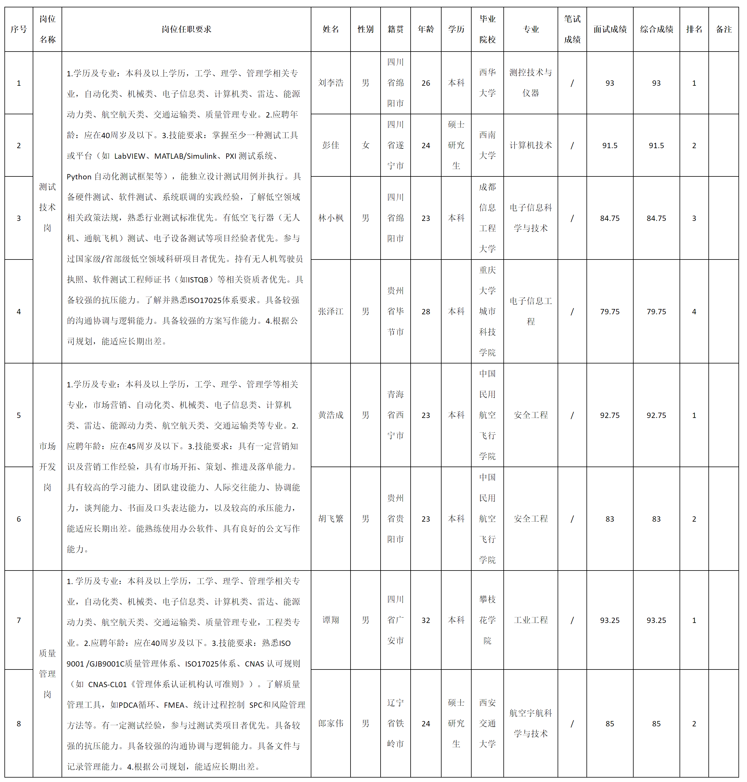 根據(jù)四川九洲永昌檢測技術(shù)服務(wù)有限責(zé)任公司發(fā)布的招聘公告及招聘相關(guān)規(guī)定,現(xiàn)將測試成績予以公示。