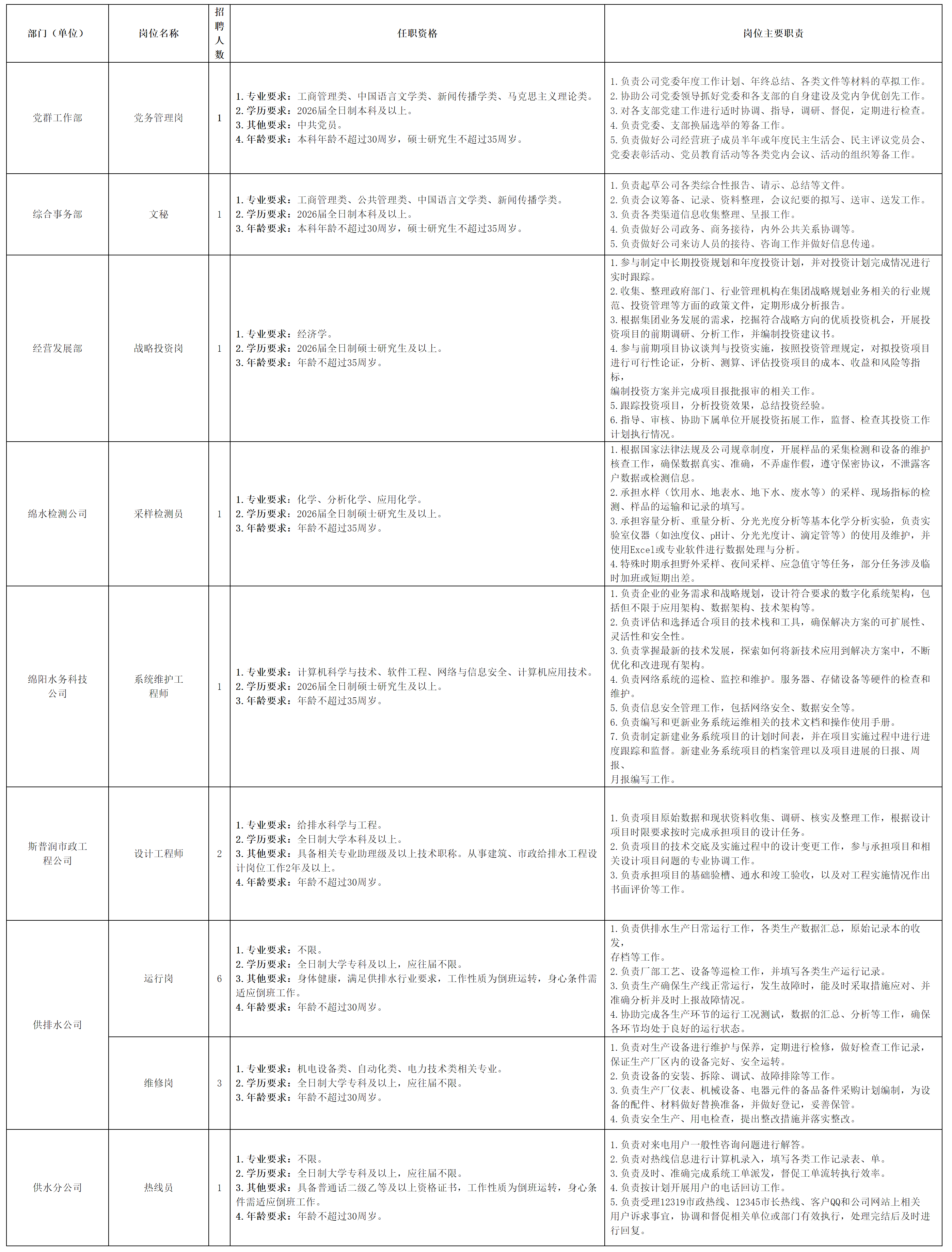 綿陽市水務(集團)有限公司是綿陽市市屬重要國有骨干企業(yè),始建于1966年,資產(chǎn)總額67億元,公司下轄9家全資、控股、參股子公司,內(nèi)設2家分公司。主要經(jīng)營城鎮(zhèn)供水、污水處理、垃圾處理、供排水工程設計、工程施工及其他業(yè)務,運營4座自來水廠、5座污水處理廠(站),設計日供水能力70萬立方米,日污水處理能力48.25萬立方米。公司恪守“水善利萬物”的經(jīng)營理念,以保障供水、服務社會、凈化污水、保護環(huán)境為己任,搶抓國家生態(tài)文明建設機遇,圍繞打造省內(nèi)水務行業(yè)標桿企業(yè)的總目標,堅持做強做優(yōu)城市供排水主業(yè),持續(xù)增強要素保障的核心功能,在發(fā)揮中國科技城優(yōu)勢,為加快建成省域經(jīng)濟副中心上持續(xù)貢獻水務力量。按照公開、平等、競爭、擇優(yōu)的原則,綿陽市水務(集團)有限公司(以下簡稱“水務集團”)現(xiàn)面向社會公開招聘工作人員,現(xiàn)將有關事項公告如下: