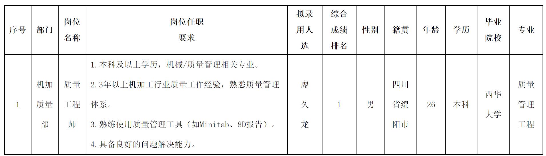 根據(jù)四川波鴻實(shí)業(yè)有限公司發(fā)布的招聘公告及招聘相關(guān)規(guī)定,經(jīng)面試、體檢等程序,擬錄用廖久龍同志到威斯卡特(綿陽(yáng))汽車零部件制造有限公司工作,現(xiàn)予以公示,具體情況如下: