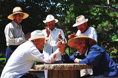 兩位老人在公園掰手腕