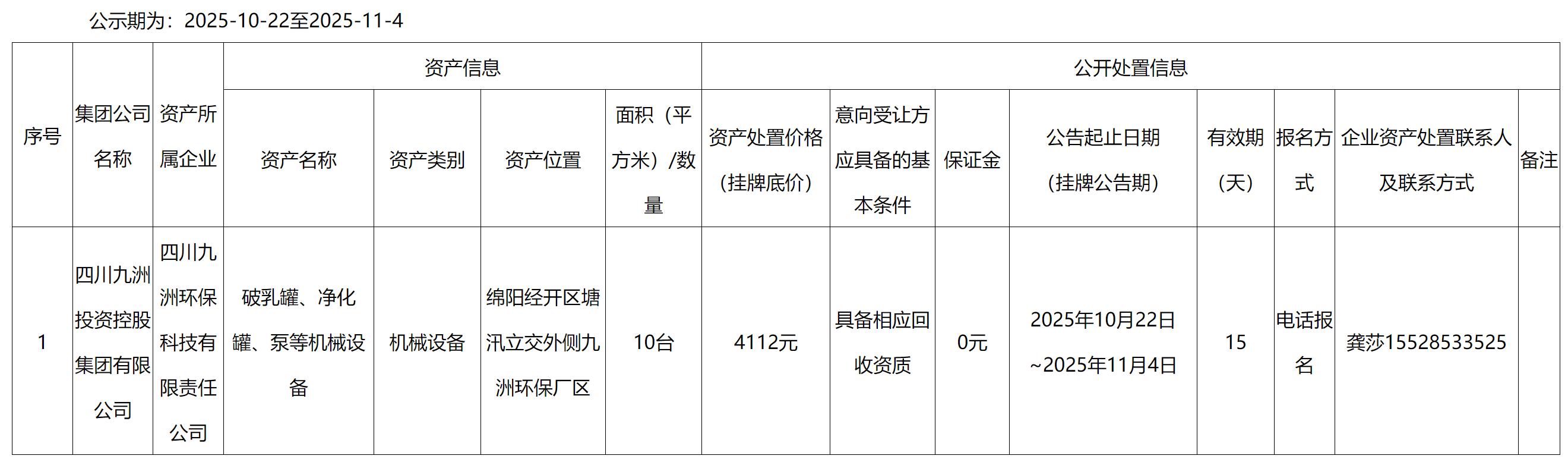 四川九洲環(huán)保科技有限責(zé)任公司破乳罐、凈化罐、泵等機(jī)械設(shè)備資產(chǎn)處置公告