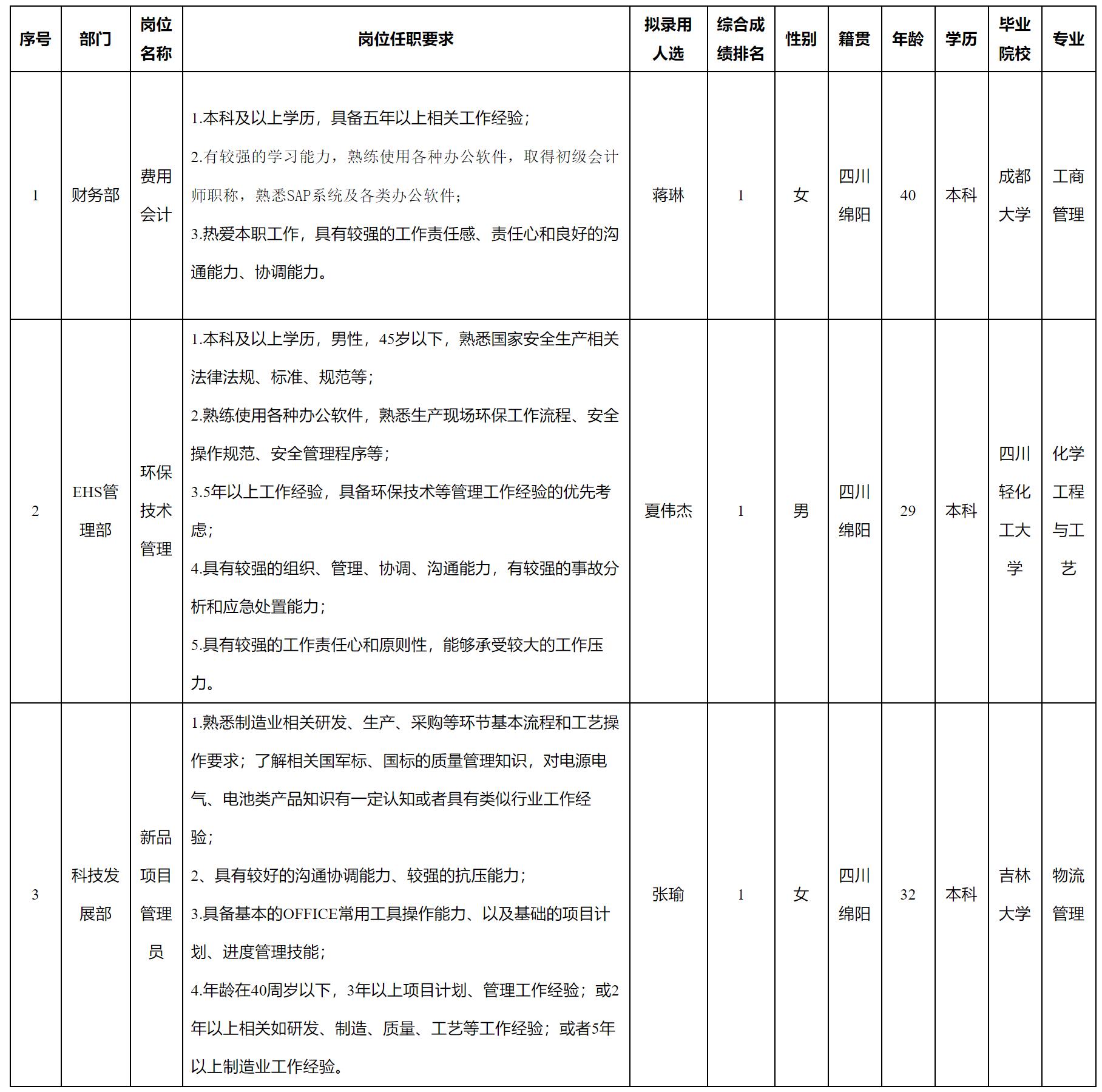 根據(jù)四川長虹電源股份有限公司發(fā)布的招聘公告及招聘相關(guān)規(guī)定,經(jīng)測試、考察、體檢等程序,擬錄用蔣琳、夏偉杰、張瑜同志到我司工作,現(xiàn)予以公示,具體情況如下: