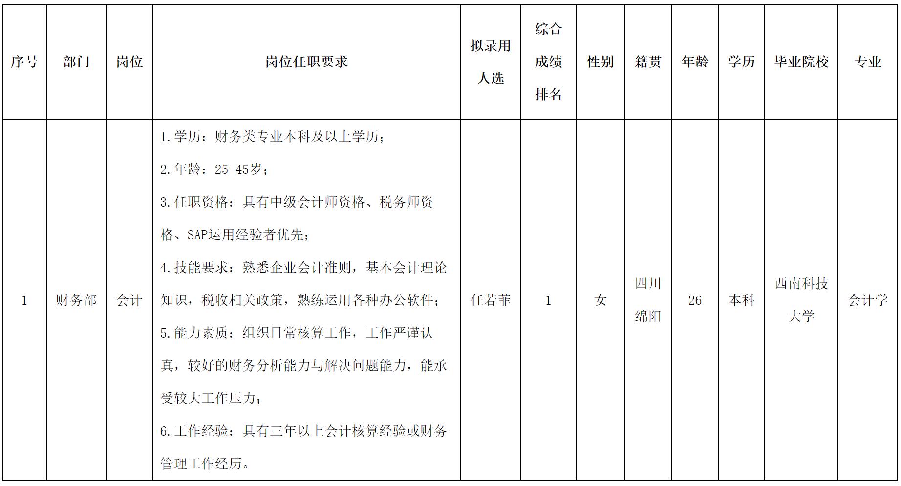 根據(jù)四川長虹國際酒店有限責(zé)任公司發(fā)布的招聘公告及招聘相關(guān)規(guī)定,經(jīng)筆試、面試、考察、體檢等程序,擬錄用任若菲同志到長虹國際酒店工作,現(xiàn)予以公示,具體情況如下: