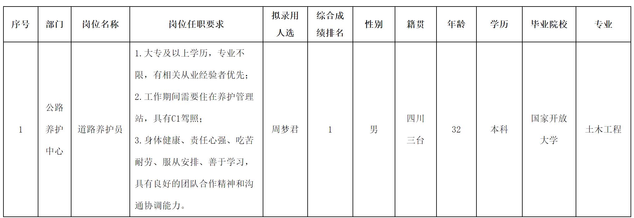 根據(jù)2025年退役軍人就業(yè)服務(wù)專項行動——“戎耀歸蜀”綿陽退役軍人及軍屬招聘活動及綿陽路橋建設(shè)集團有限責(zé)任公司招聘相關(guān)規(guī)定,經(jīng)面試、考察、體檢等程序,擬錄用周夢君同志到綿陽路橋建設(shè)集團有限責(zé)任公司工作,現(xiàn)予以公示,具體情況如下: