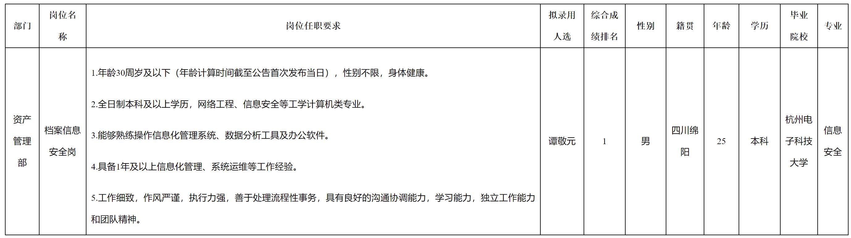 根據(jù)綿陽市綿投商業(yè)運(yùn)營管理有限責(zé)任公司發(fā)布的招聘公告及招聘相關(guān)規(guī)定,經(jīng)筆試、面試、背景調(diào)查、體檢等程序,擬錄用譚敬元同志到綿陽市綿投商業(yè)運(yùn)營管理有限責(zé)任公司工作,現(xiàn)予以公示,具體情況如下: