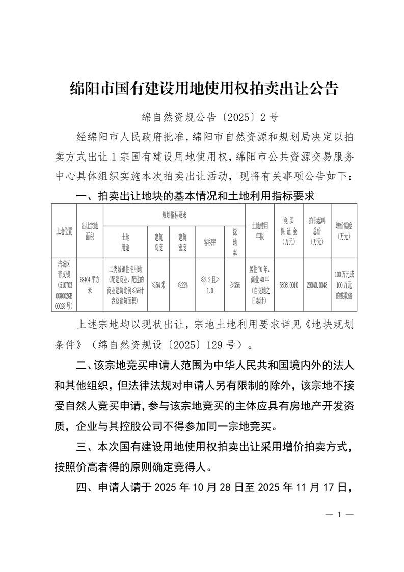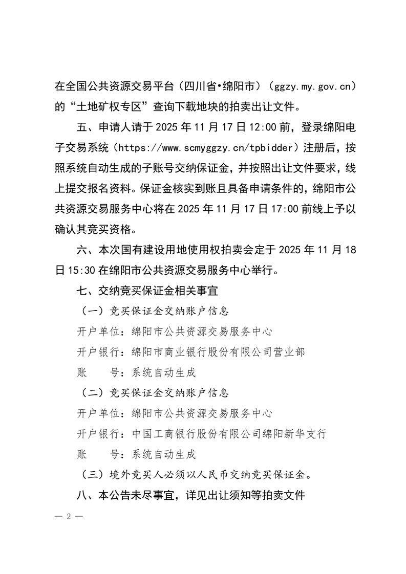 綿陽市國有建設(shè)用地使用權(quán)拍賣出讓公告(綿自然資規(guī)公告〔2025〕2號)
