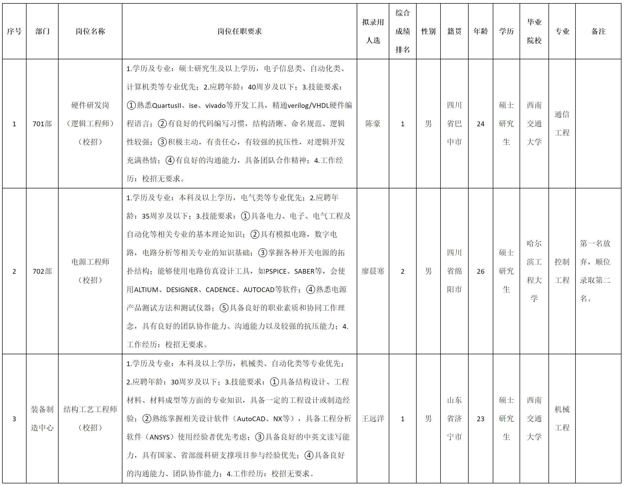 根據(jù)四川九洲電器集團(tuán)有限責(zé)任公司發(fā)布的招聘公告及招聘相關(guān)規(guī)定,經(jīng)測(cè)試、考察、體檢等程序,擬錄用陳豪等3名同志到四川九洲電器集團(tuán)有限責(zé)任公司工作,現(xiàn)予以公示,具體情況如下: