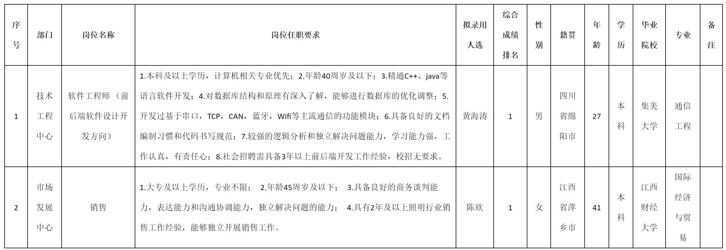 根據(jù)四川九洲光電科技股份有限公司發(fā)布的招聘公告及招聘相關(guān)規(guī)定,經(jīng)測試、考察、體檢等程序,擬錄用黃海濤等2名同志到四川九洲光電科技股份有限公司工作,現(xiàn)予以公示,具體情況如下:
