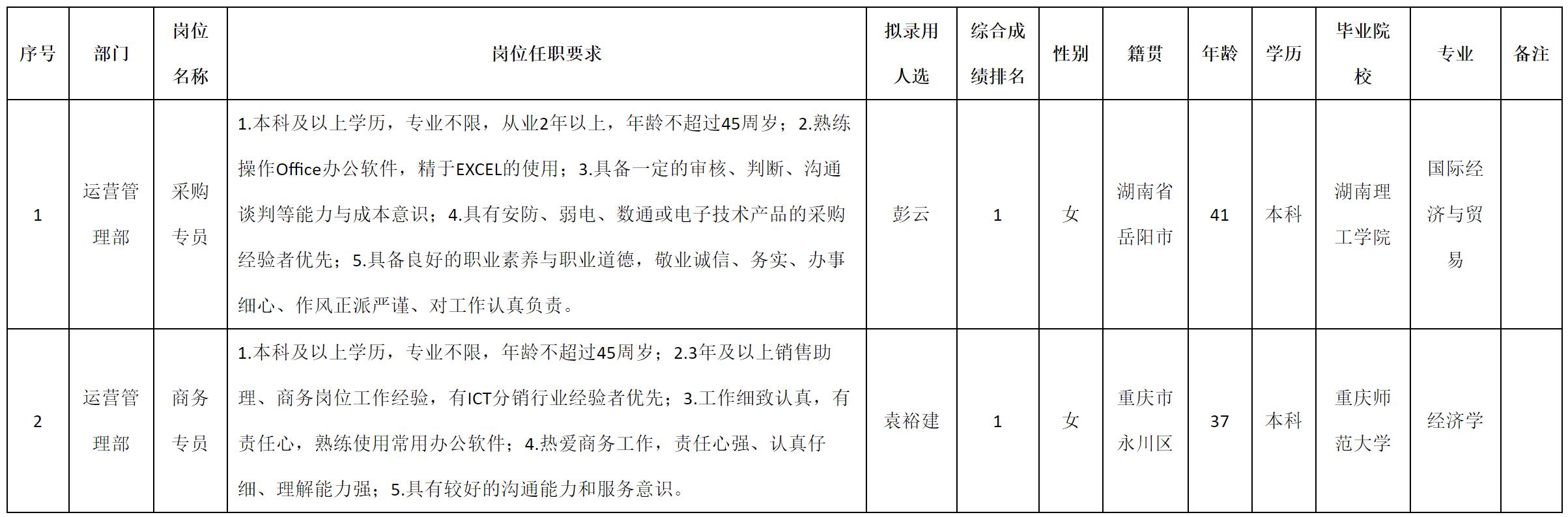 根據(jù)四川科瑞軟件有限責(zé)任公司發(fā)布的招聘公告及招聘相關(guān)規(guī)定,經(jīng)測(cè)試、考察、體檢等程序,擬錄用彭云等2名同志到四川科瑞軟件有限責(zé)任公司工作,現(xiàn)予以公示,具體情況如下:
