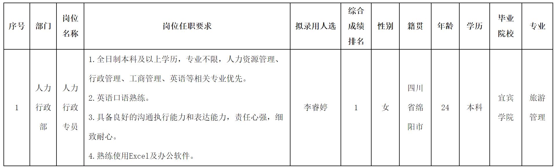 根據(jù)四川波鴻實(shí)業(yè)有限公司發(fā)布的招聘公告及招聘相關(guān)規(guī)定,經(jīng)面試、體檢等程序,擬錄用李睿婷同志到威斯卡特(綿陽)汽車零部件制造有限公司工作,現(xiàn)予以公示,具體情況如下: