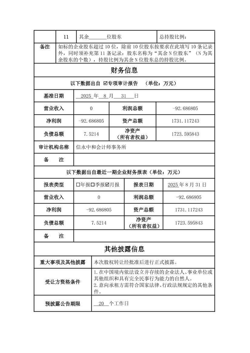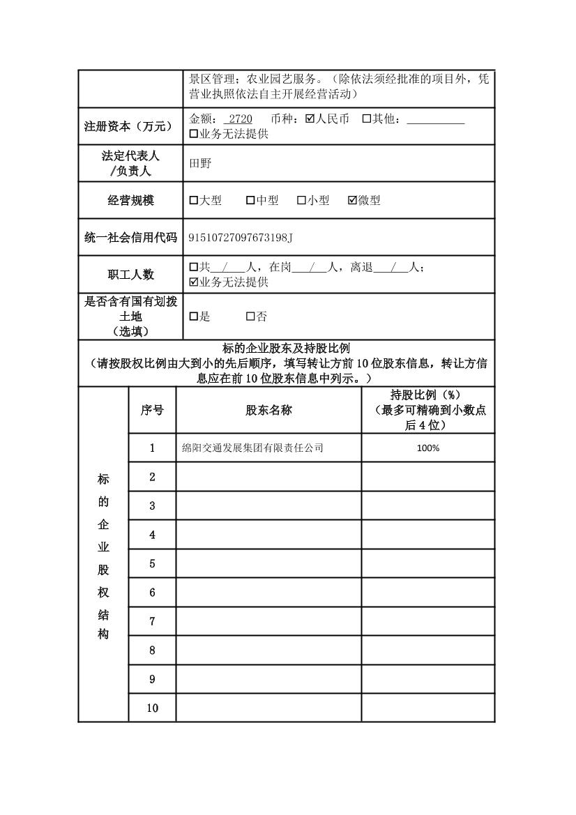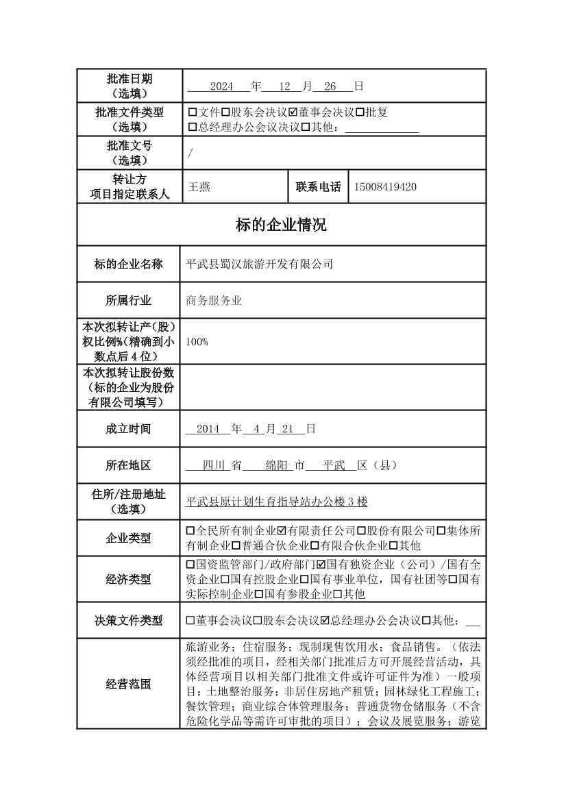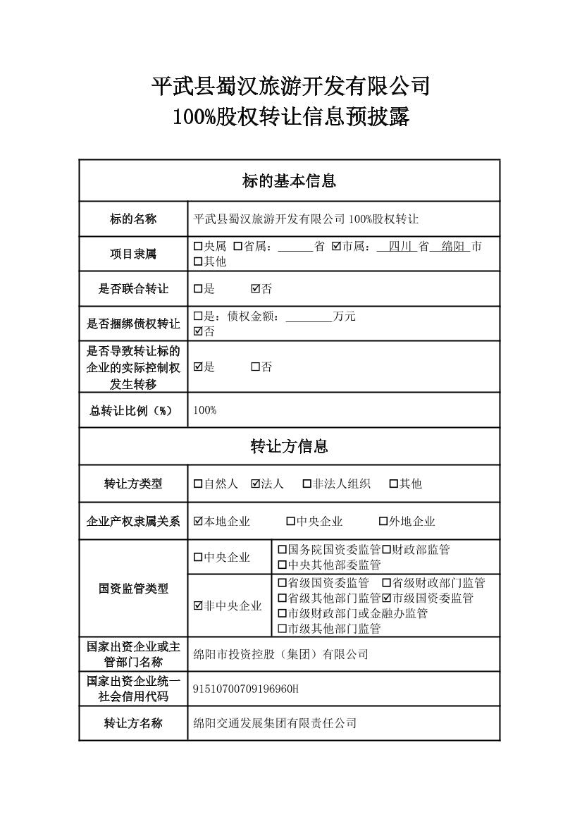 平武縣蜀漢旅游開發(fā)有限公司100%股權(quán)轉(zhuǎn)讓信息預(yù)披露