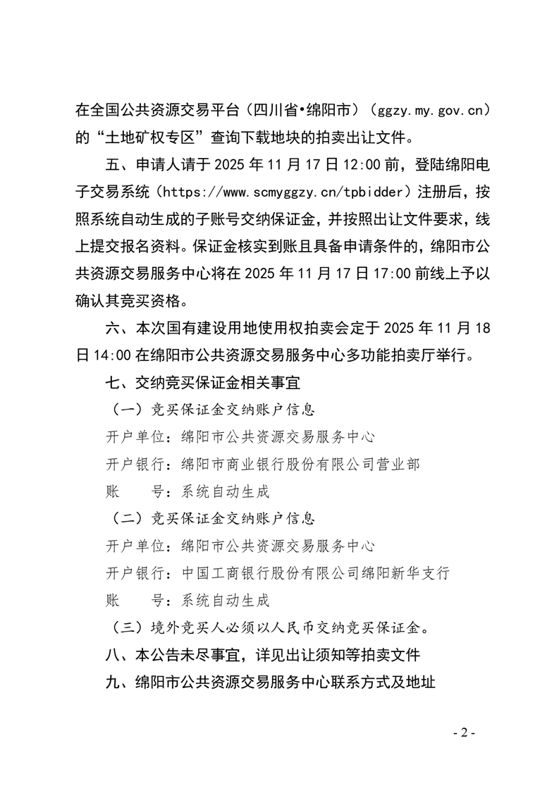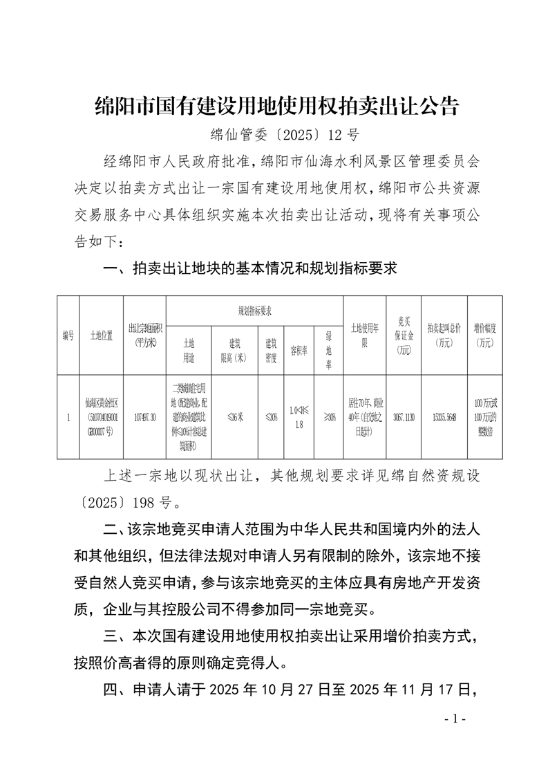 綿陽(yáng)市國(guó)有建設(shè)用地使用權(quán)拍賣出讓公告(綿仙管委〔2025〕12號(hào))