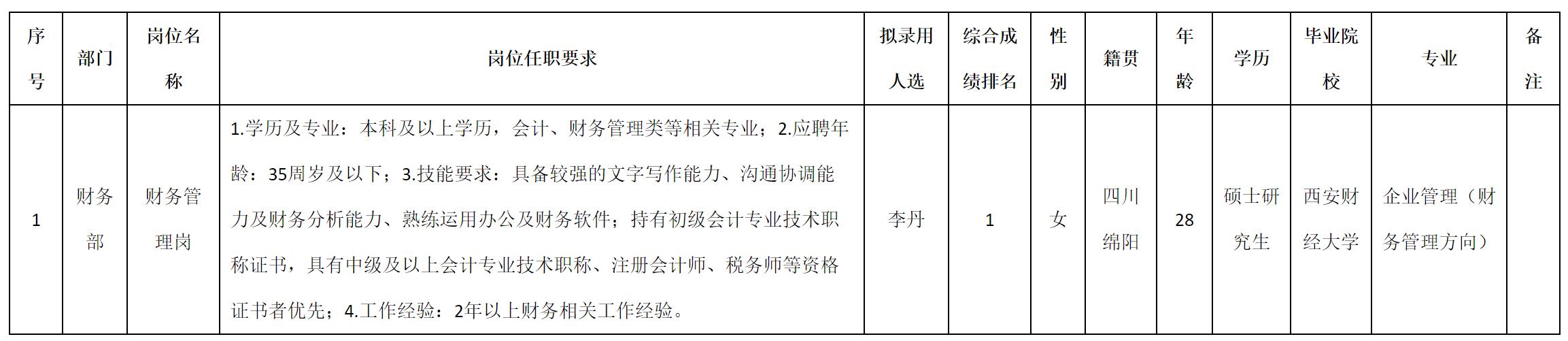 根據(jù)四川九洲電器股份有限公司發(fā)布的招聘公告及招聘相關(guān)規(guī)定,經(jīng)測試、考察、體檢等程序,擬錄用李丹同志到四川九洲電器股份有限公司工作,現(xiàn)予以公示,具體情況如下: