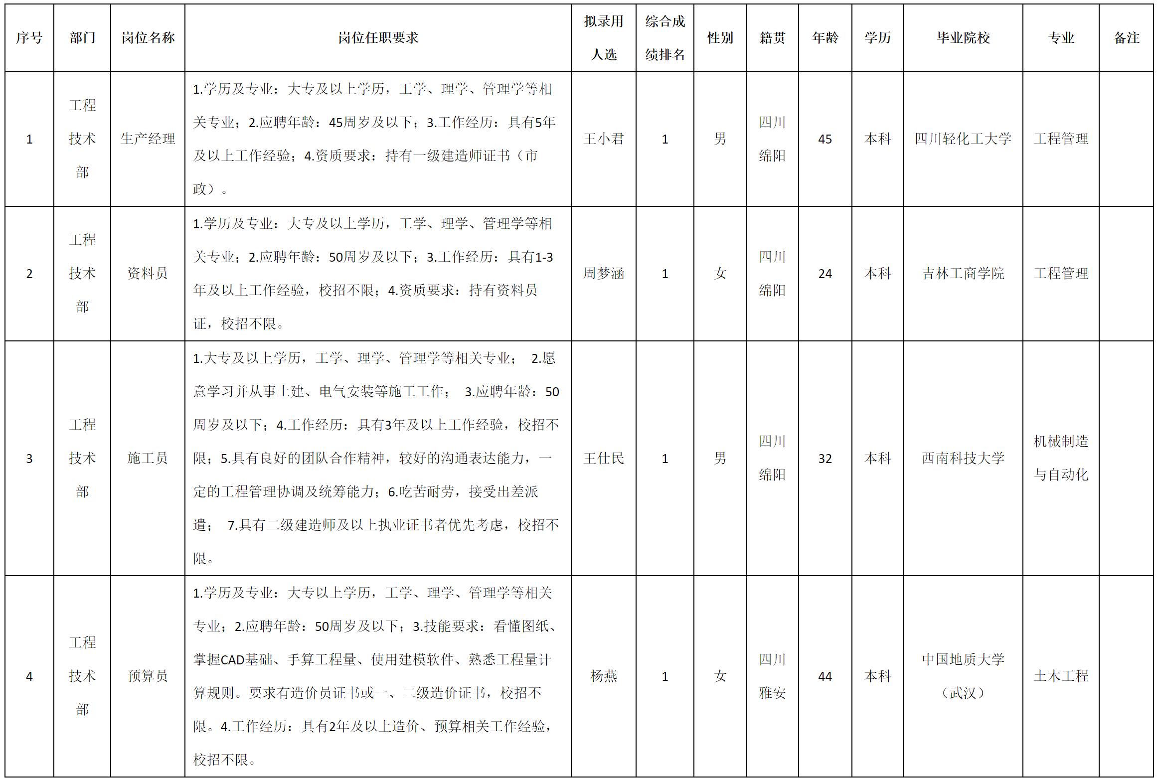 根據(jù)四川九洲建筑工程有限責(zé)任公司發(fā)布的招聘公告及招聘相關(guān)規(guī)定,經(jīng)測試、考察、體檢等程序,擬錄用王小君等4名同志到四川九洲建筑工程有限責(zé)任公司工作,現(xiàn)予以公示,具體情況如下:
