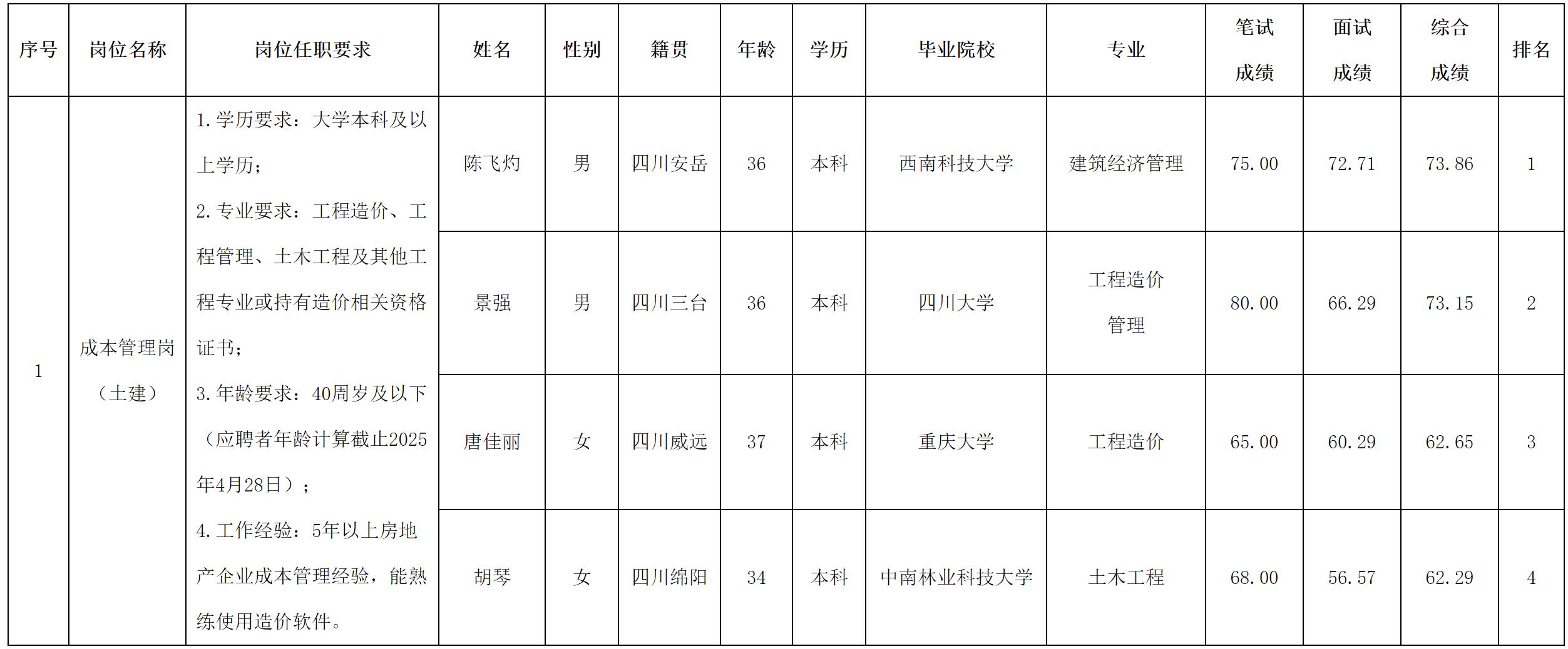 根據(jù)綿陽市綿投置地有限公司發(fā)布的招聘公告及招聘相關規(guī)定,經(jīng)筆試、面試等程序,現(xiàn)將筆試、面試成績予以公示。
