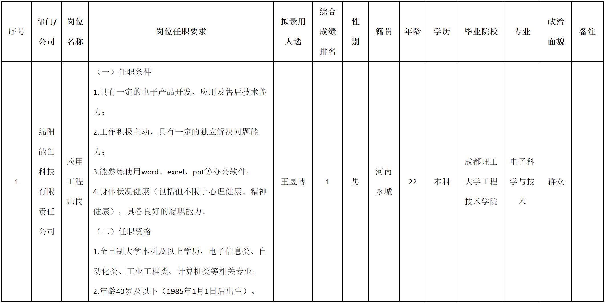 根據(jù)綿陽燃氣集團發(fā)布的招聘公告及招聘相關(guān)規(guī)定,經(jīng)筆試、面試等程序,現(xiàn)將擬錄用王昱博同志到綿陽能創(chuàng)科技有限責任公司工作,現(xiàn)予以公示,具體情況如下: