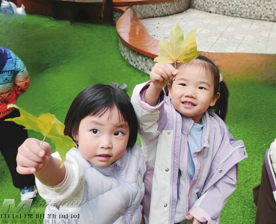開元實(shí)驗幼兒園的孩子展示五彩斑斕的樹葉。 記者 李錦輝 攝