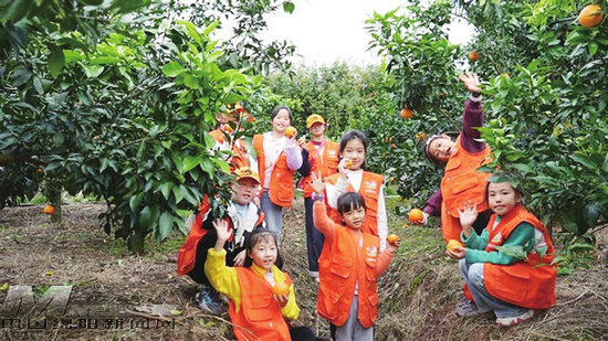 “橙園課堂”上,老師教孩子們通過顏色、手感和重量判斷橘子成熟度。講解完畢,孩子們分工合作,高個子摘高處果實(shí),矮個子撿低處橘子,果園里滿是驚喜的呼喊。