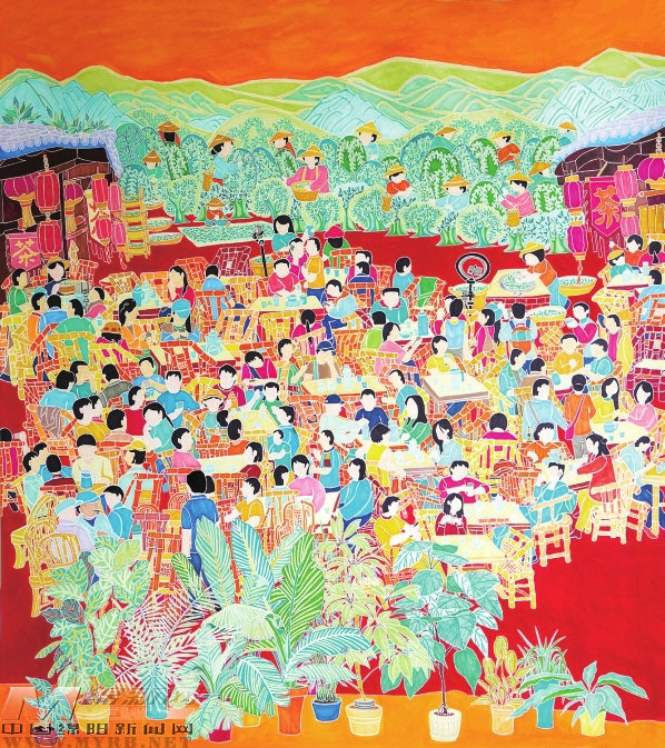 楊若雪的《茶香傳薪新·享茶品豐饒》,以幾何化梯田、圓桌茶宴構建畫面秩序感,夸張變形的人物輪廓與茶樹形態(tài)釋放出情感張力,形成“拙中藏巧”的視覺語言。作品前半部分,茶農古法采茶、曬青、炒制的場景,與網絡直播賣茶的光影交織,傳統(tǒng)技藝與數字浪潮在茶香中完成對話;后半部分,游客圍坐茶宴,笑語隨茶湯漾開,品茗被升華為一場鄉(xiāng)村美學儀式。作品以“薪火”延續(xù)文化基因,以“豐饒”描繪產業(yè)圖景,在鄉(xiāng)土煙火中熔鑄時代精神,觀者既能看見茶山律動,亦能品讀鄉(xiāng)村振興的壯闊史詩。
