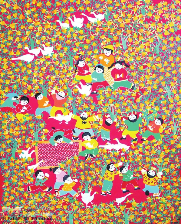 陳維兵的《幸福果農》扎根鄉(xiāng)村生活,聚焦勞動場景與幸福生活景象。作品通過夸張的造型和濃烈的色彩,生動刻畫村民協(xié)作勞動的畫面,風格吉祥喜慶,傳遞出老百姓樂觀向上的生活追求與審美情趣。畫面色彩絢麗濃烈,裝飾感平和自然,線條簡練利落,既凸顯農民畫質樸奔放的藝術特色,也表達了老百姓對美好生活的向往,以及對真善美的渴望與追求。