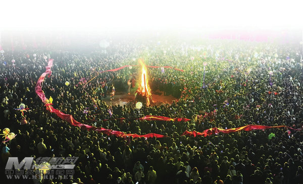 萬人篝火晚會(huì)上,游客手拉手跳沙朗。 北川融媒供圖