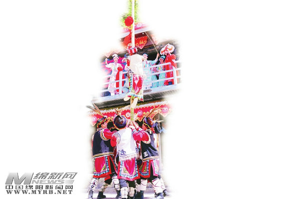 羌族民俗爬桿表演。 北川融媒供圖