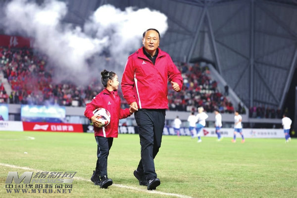 10月25日晚,川超綿陽九洲長虹隊對陣廣元劍門雄關隊的比賽現(xiàn)場,中國工程物理研究院(簡稱“中物院”)老一輩科研工作者子弟、四川省足球協(xié)會原秘書長李日新,與中物院新生代科研工作者子女、綿陽科學城春蕾學校學生韓思媛,攜手為比賽開球。